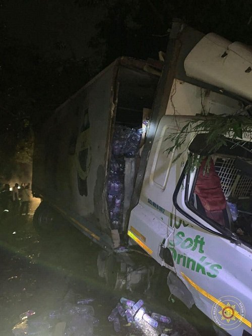 A DAF cargo truck with registration number GR 3583-15 loaded with over 1,000 cartons of bottled water had veered off the road, trapping the driver inside due to severe damage to the head compartment.