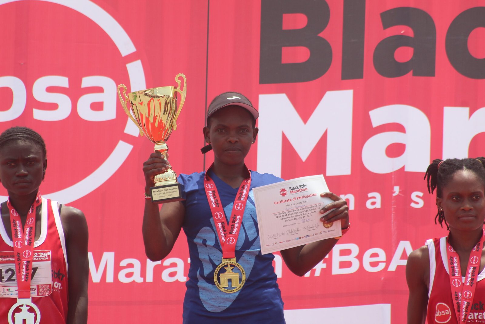 The title for the men’s 42-kilometer wheelchair race went to para-athlete, Raphael Botsyo Nkegbe. Seidu Sule Savalugu and Patrick Kodor finished second and third, respectively. They received cash prizes of GH¢10,000, GH¢5,000, and GH¢3,000, along with medals, certificates, and products from sponsors.