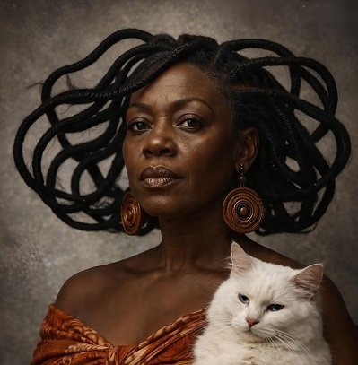 The large circular earrings also frame the face and add to the sense of cultural identity. The presence of the white cat introduces another layer of meaning. Its calm and still posture may symbolise quiet awareness, intuition, or even a spiritual companion. The contrast between the dark skin of the subject and the white fur of the cat creates visual balance while also suggesting a meeting of different energies seen and unseen, physical and spiritual.