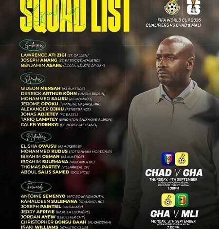 Black Stars head Coach Otto Addo has named a 24-man squad for the upcoming 2026 FIFA World Cup qualifiers against Chad and Mali next month.