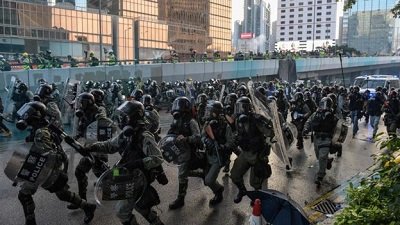 Reports say some protesters threw bricks at police outside China’s People’s Liberation Army base, which is near to the Hong Kong parliament and government offices.